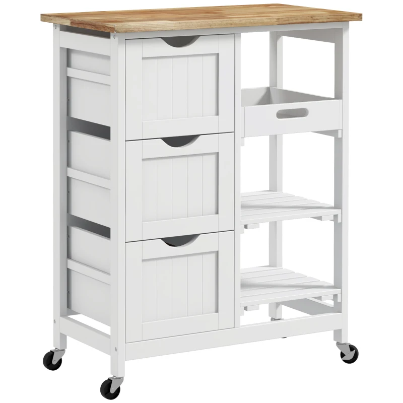 HOMCOM Carrello da Cucina in Legno con 3 Cassetti e 3 Ripiani Aperti, 67x37x85.5 cm, Bianco